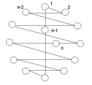 In bovenstaande graaf is vertex 1 met 2 verbonden; vertex 2 met n-1, vertex n-1 met 3, vertex 3 met n-2 etcetera. Verder is vertex 1 verbonden met de "speciale" vertex n en is n op zijn beurt weer verbonden met (n+1)/2. Noem deze Hamiltoniaanse cykel R en zij a de permutatie (n)(1 2 3 ... n-1). Dan geeft { ai(R) | i = 1,...,(n-1)/2 } een Hamitoniaanse decompositie van Kn.